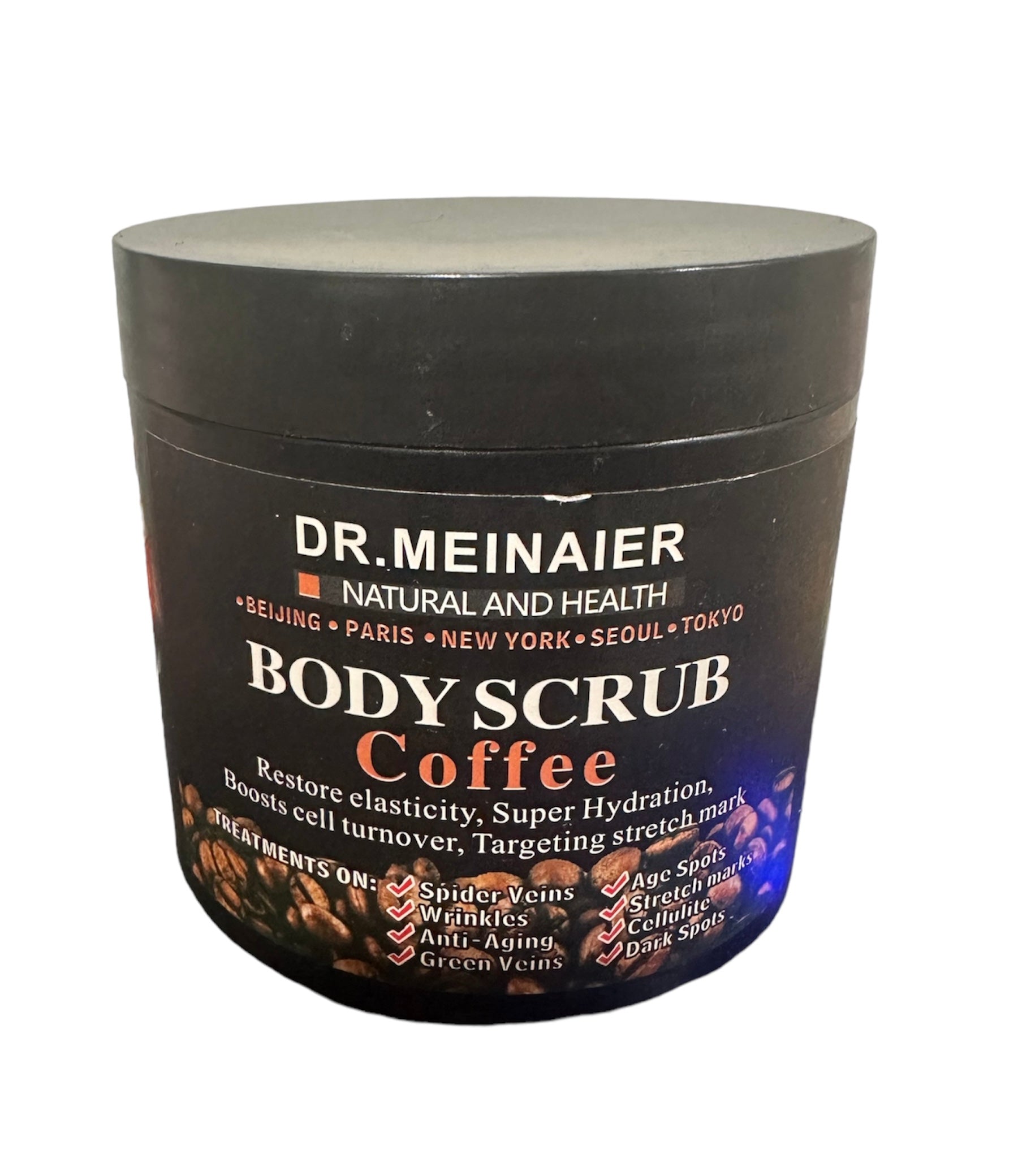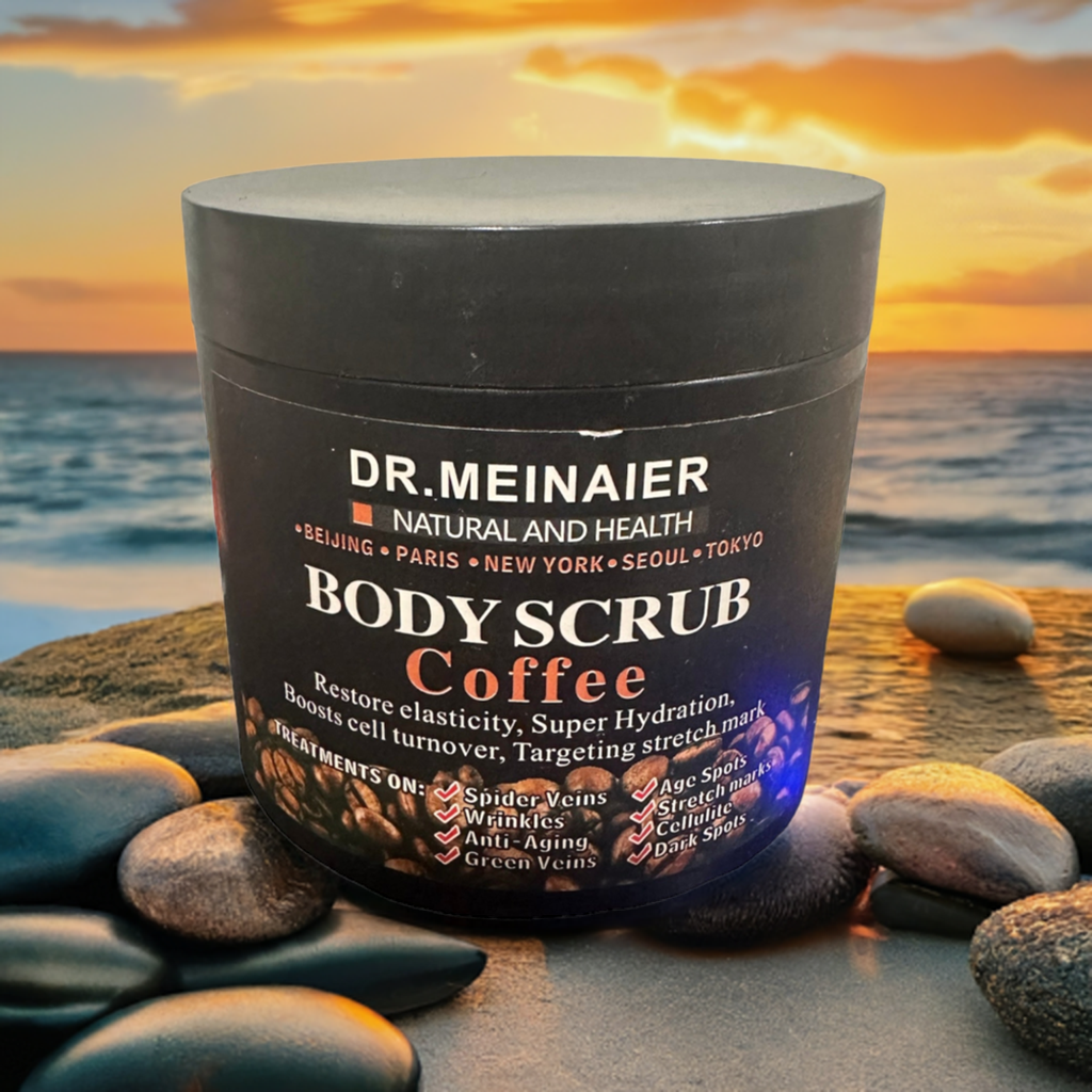 Arabica coffee body scrub loaded with antioxidants to stimulate blood flow: dead sea salt exfoliates dead skin cells, dirt and toxins.